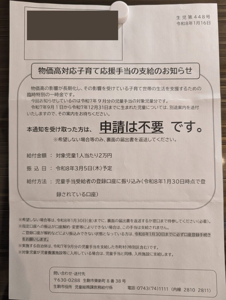 実体験│生駒市の物価高対応子育て応援手当の案内は?(実際に届いた通知内容を紹介)
